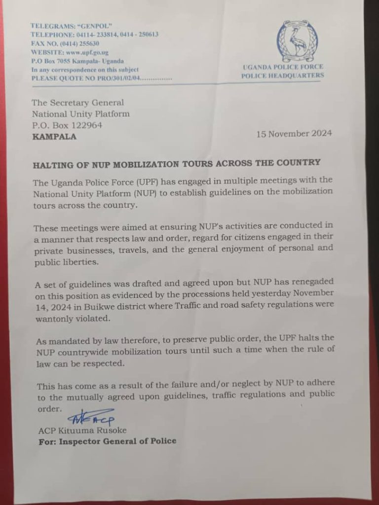 In a letter addressed to the NUP Secretary General, police spokesperson Rusoke Kituuma announced the indefinite suspension of the tours. The letter cited the party’s failure to adhere to agreed guidelines as the primary reason for the decision.